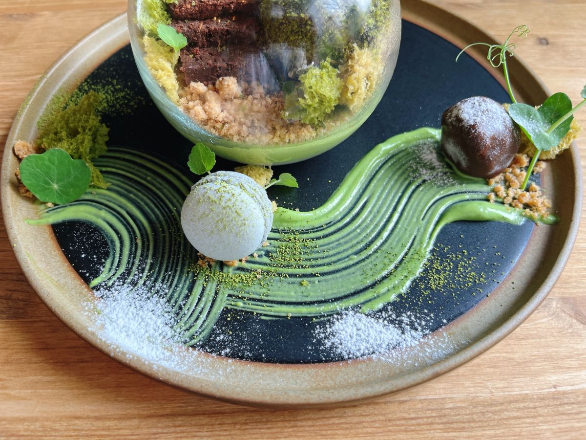 川の流れをイメージしたというお皿の上のアートは、抹茶のソースとマカロン、チョコレートでコーティングしたパッションフルーツのアイスでできています。さまざまなこだわりがぎゅっと凝縮されたアートなパフェ。目で見て癒やされ、食べてリフレッシュする、この夏必食の一皿です。