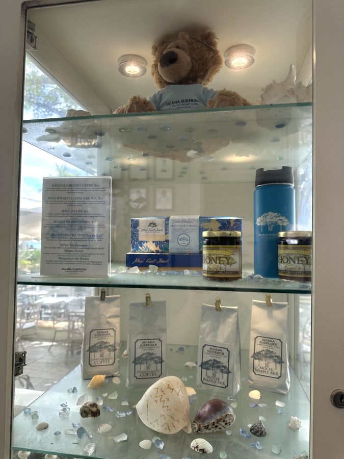 ザ・ベランダのレストラン前におみやげのディスプレイがあります。こちらは、プールサイドにあるサーフライダーカフェにて購入できます。マウイ島のトロピカルフルーツを使ったフルーツゼリーの「Maui Fruit Jewels(マウイフルーツジェエル)」$15、「モアナ・アイランド・ハニー」$15、のほか、紅茶やコーヒー、ワッフルの粉など、幅広い品揃え。