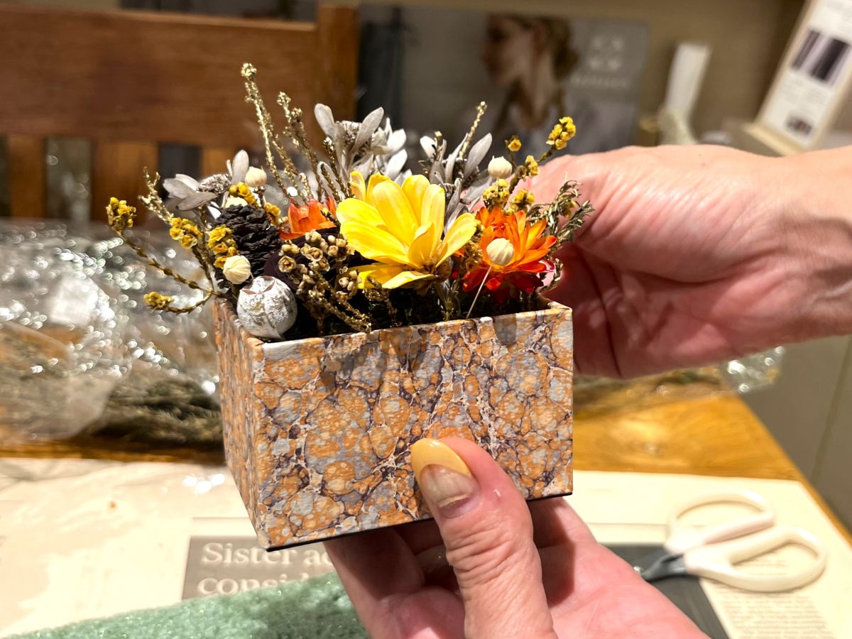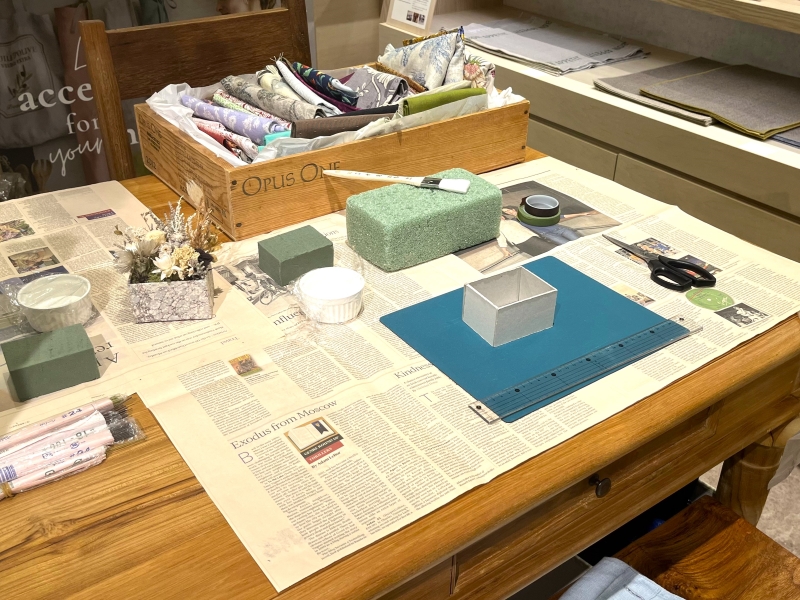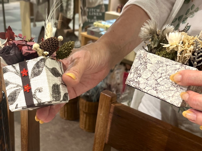 気軽に質問してOKな雰囲気もあり、不器用さんや初心者にもおすすめですよ。納得がいくまで、花器に貼る布・紙やプリザーブドフラワーを選ぶことができるのも嬉しいです。