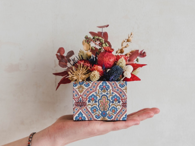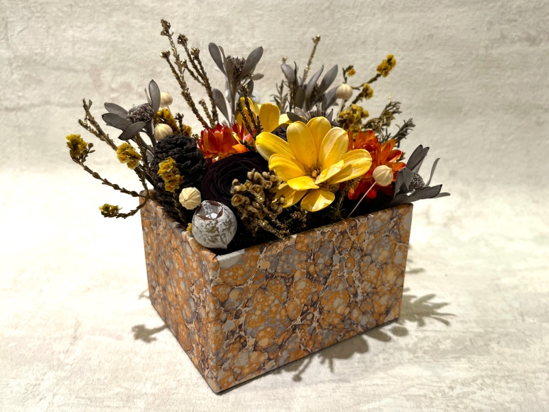 フランスの伝統技法である「カルトナージュ」とは、厚紙を組み立てて箱にし、そこに布やペーパーを貼り付けてオリジナルの容器を作ることを指します。そこに、同じくフランス発祥の「プリザーブドフラワー」を中心とした花材をアレンジした作品が「カルトナージュフラワー」です。本ワークショップは、1度で2つの技法を楽しめる講座となっています!