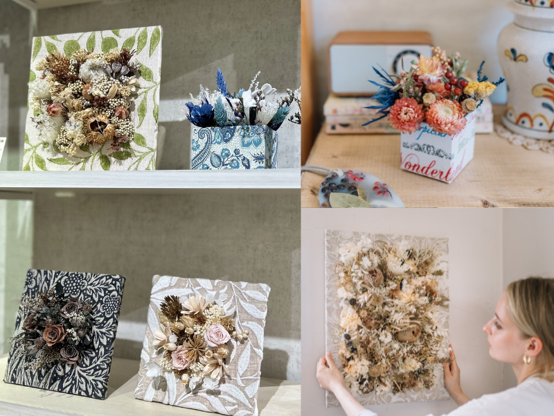 また、本日の講師かつフラワーデザイナーである大谷さんが製作した「カルトナージュフラワー」を購入することもできます。大きさや形もさまざまで、額のように飾れるタイプや、今回製作した枡形のものなども取り揃えられています。講座後はぜひ、ショッピングも楽しみたいですね♪