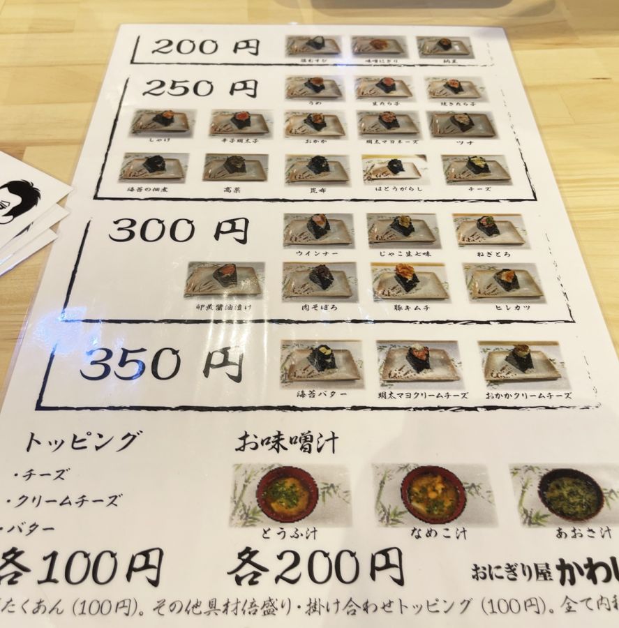 メニューにはシンプルな「塩むすび」「味噌にぎり」各200円をはじめ、「しゃけ」「高菜」「ツナ」各250円などの定番、さらに「ウィンナー」「ヒレカツ」「ねぎとろ」各300円などの変わり種まで、約30種類がラインアップ。