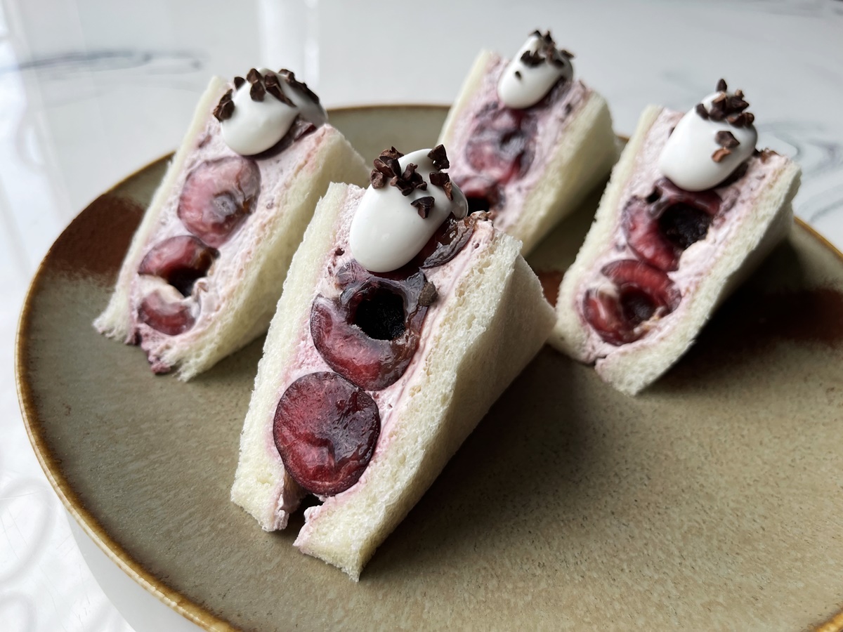 今回いただいたのは、旬の時期が短いことから「早い者勝ち」とおすすめしていただいた「アメリカンチェリーのフルーツサンド」。(6/25で提供終了。夏に向けて桃とメロンの2種が登場予定)