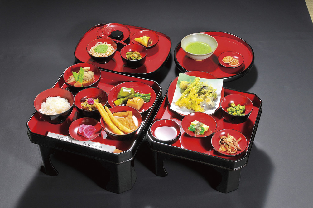 羽黒山参道三の坂を上った場所にある参籠所。精進料理は出羽三山の山麓でとれる旬の山菜などを素材に使用しています。