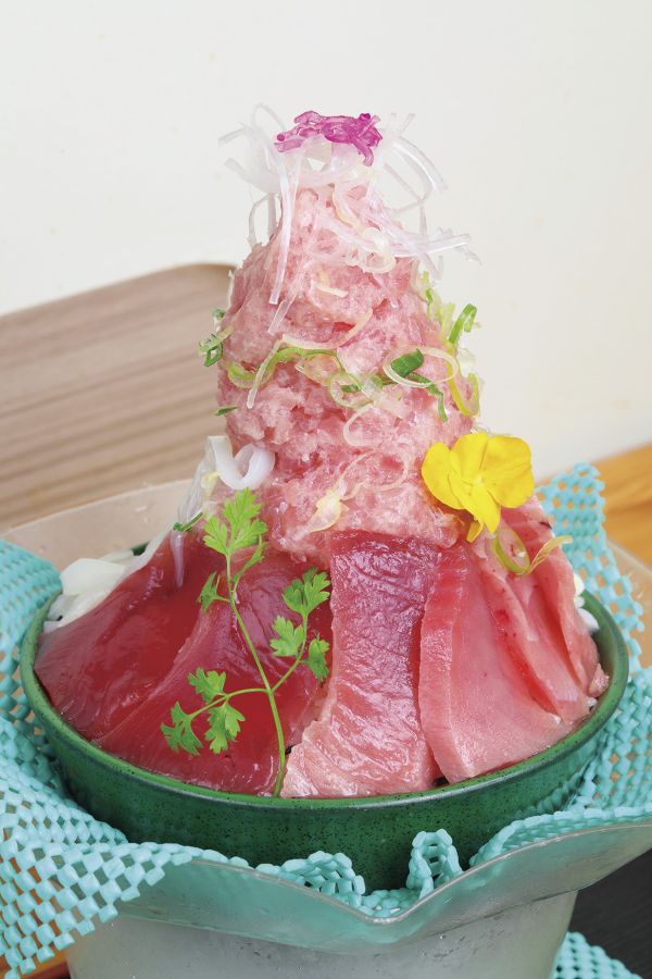 海鮮や野菜、果物などさまざまな商品を扱う店が集結する市場でランチを。写真はマグロ専門店「みなと市場 小松鮪専門店」の山ほこ丼2000円。