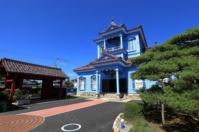 擬洋風建築の旧鶴岡警察署庁舎は、外壁の水色が印象的。