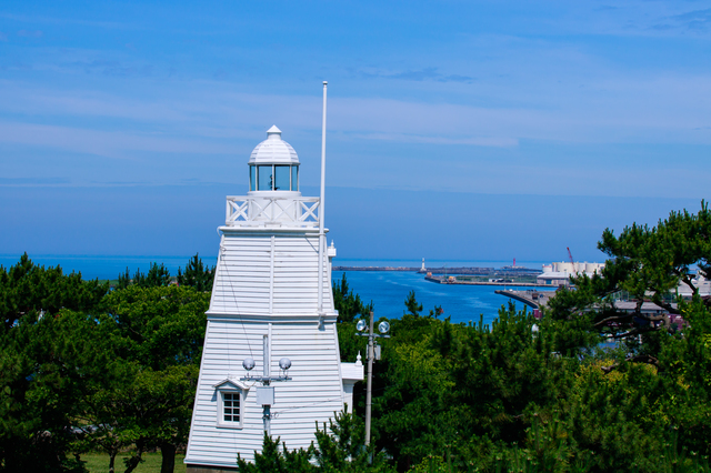 酒田市街から日本海、最上川や出羽三山まで一望できる、夕日の美しいビュースポット。日本最古級の木造六角灯台も。