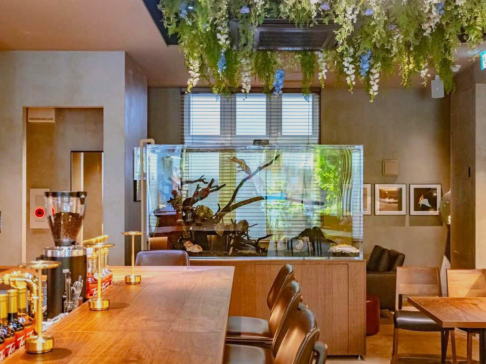 お店の中にも花やグリーンがたくさん。天井から吊り下がる植物やウッド調で揃えられたインテリア、大きな水槽もあり、オアシスのような空間が広がっています。