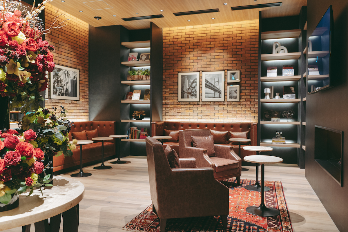 横浜らしさを感じるレンガ積みの雰囲気を表現した壁面や、迫力ある6mもの高さの天井が印象的なレセプションラウンジ。コーヒーを飲みながらちょっと休憩できるスペースもあり、チェックイン前からリラックスできる空間です。