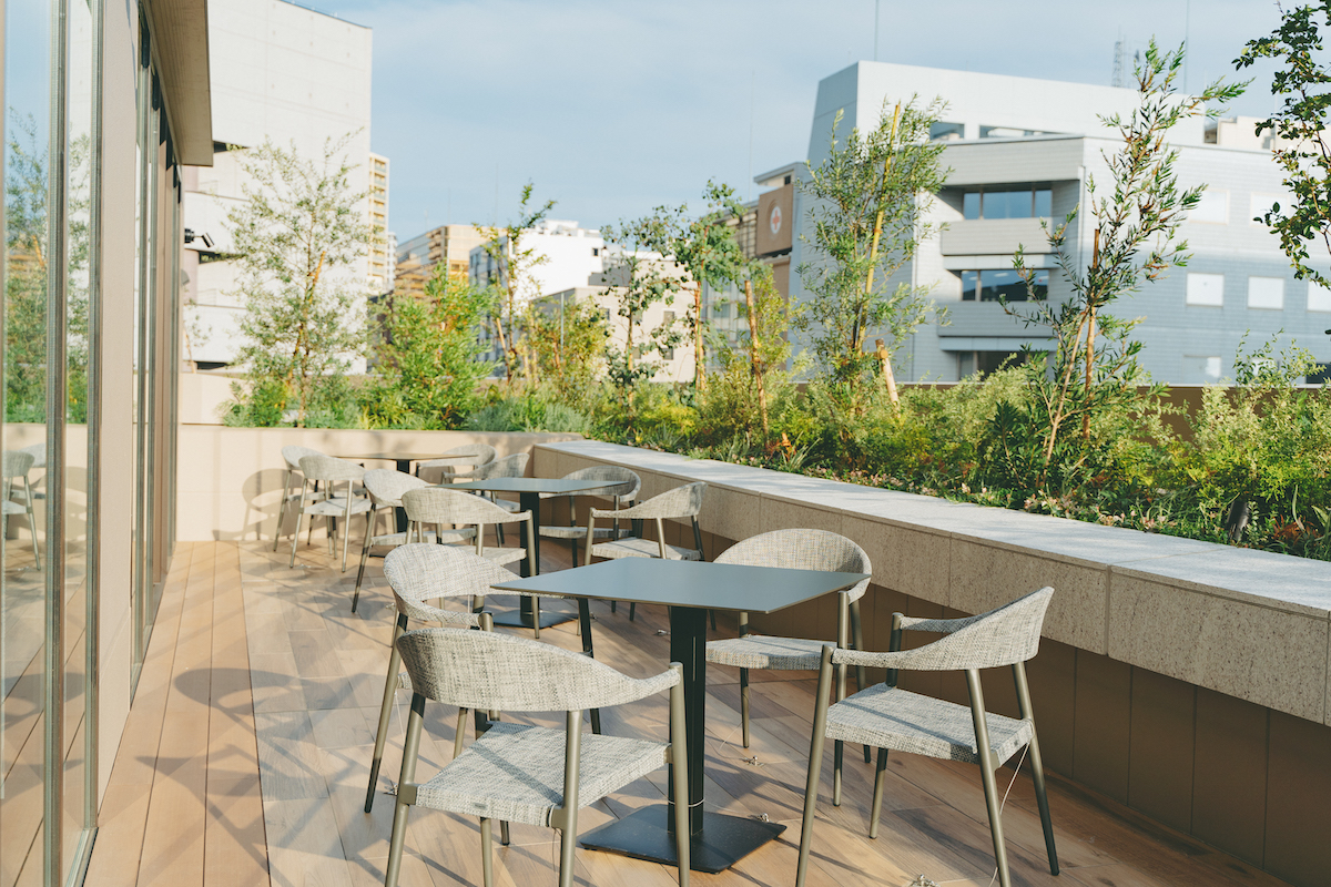 ラウンジに面した海風を感じられるテラスは、ゲストが自由に利用できる快適で心地よい空間。緑に囲まれながらコーヒー片手に読書やうたた寝にも。