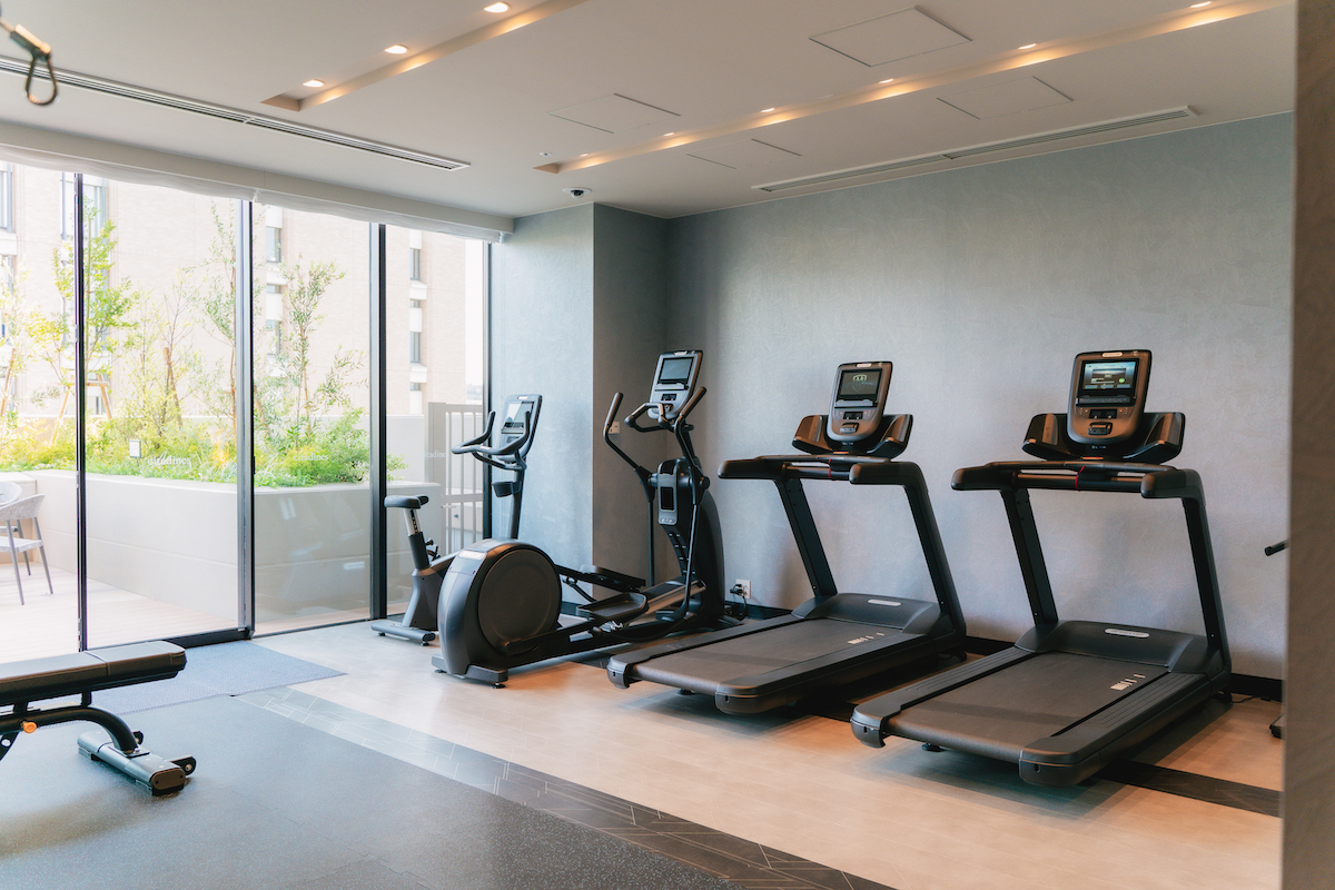 こちらは、窓から差し込む心地良い光のなかで汗を流せる、開放的なフィットネスジム。