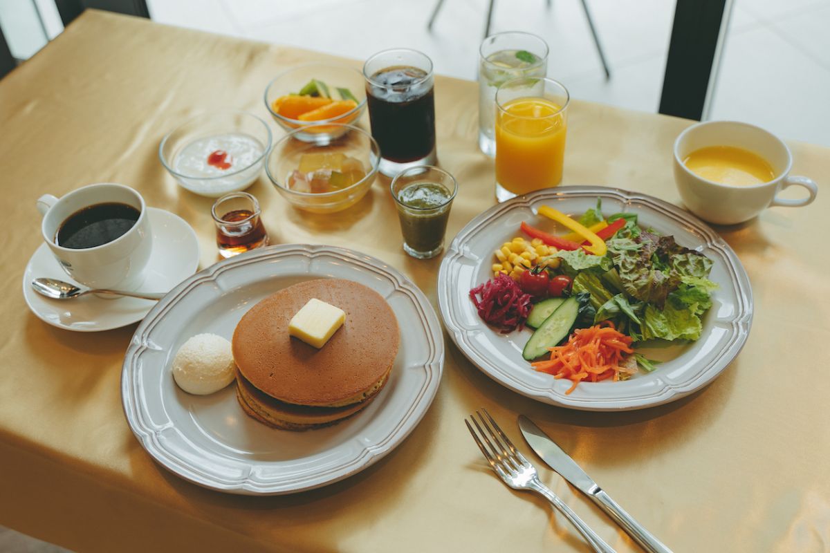 さらに宿泊者の朝食は、「珈琲館」とのコラボメニュー。看板商品の「トラディショナル・ホットケーキ」や「ビーフカレー」「ハムチーズトースト&ソーセージ」など珈琲に合う5種類のメイン料理から1品選べるスタイル。席のQRコードから注文できる手軽さもポイントです。