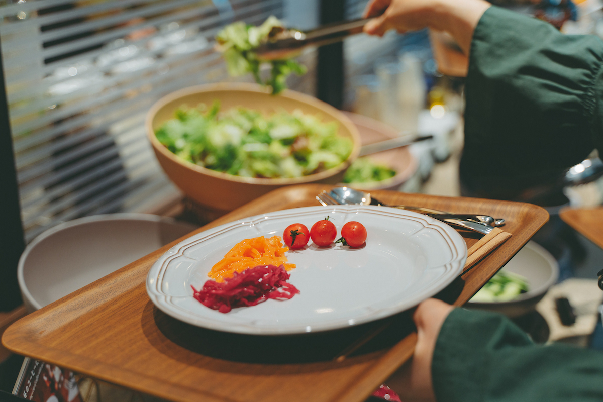 彩り豊かなサラダやフレッシュなフルーツはビュッフェ形式。スムージーやデトックスウォーターなど体に優しいドリンクとともに自分好みの朝食を楽しんで。