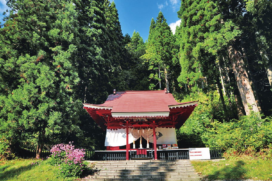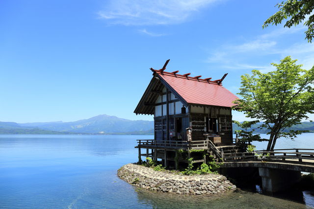 潟尻に立ち、田沢湖に張り出すような独特な造りが印象的。漢槎宮(かんさぐう)ともよばれ、流れ着いた浮木を祭ったものといわれている縁結びの神社。