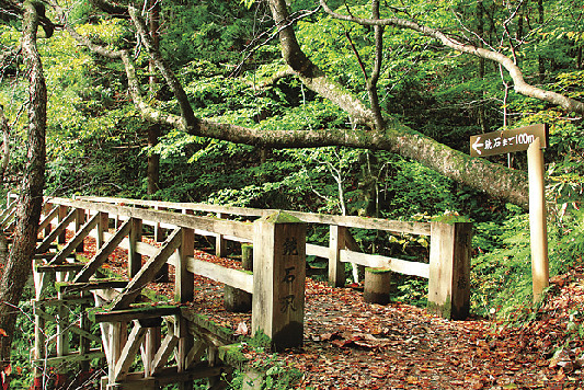 御座石神社裏手の山に辰子が化粧する際に使ったと伝わる鏡石があります。鏡石までは願い橋などご利益スポットが点在。