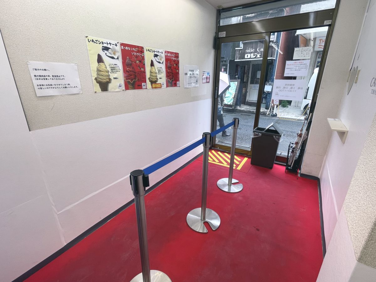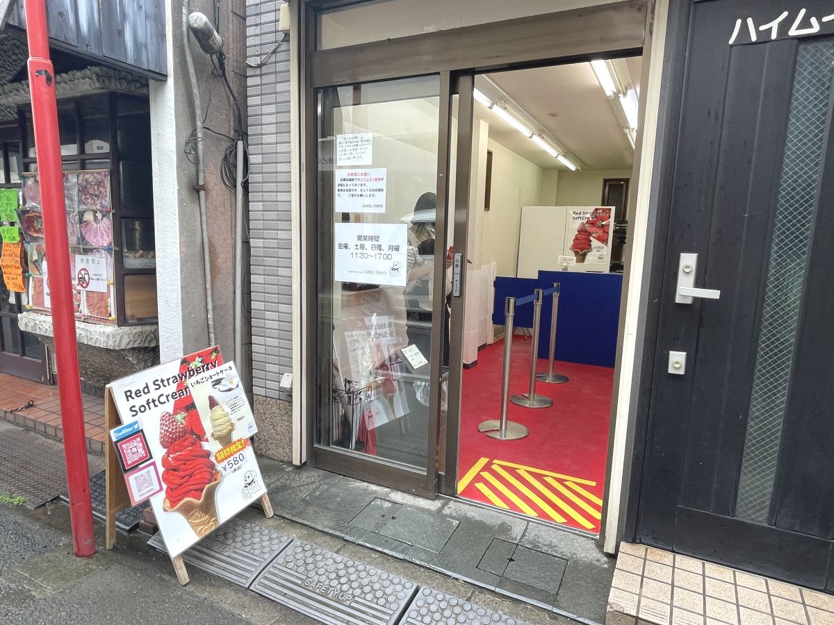 日本全国から訪れるお客さんから「東京にも出店してほしい」と要望が殺到したため、その声に応えて東京にやってきました。看板メニュー「真っ赤ないちごソフトクリーム」に負けない、真っ赤なカーペットが目印です。