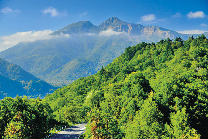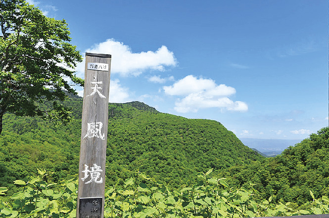 ここから見える磐梯山と安達太良山、それぞれの名峰を竜の背になぞらえ名付けられた峠の辻道。標高1546m地点を通り、傾斜と急カーブが続くので安全運転を。
