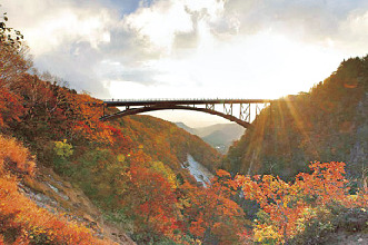 橋としては国内最高所から、山腹に艶姿を競うカエデやドウダンツツジを眺められるほか、赤いアーチ橋が周囲と融合する美しい姿を見せます。