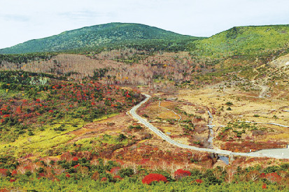 荒地の周りが点々と緋色に彩られ、10月上旬に見頃を迎えます。周辺の尾根と湿地帯ではミネザクラやナナカマドが鮮やか。