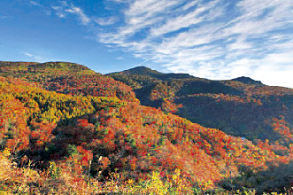 羊雲も浮かぶ秋の高い空と紅葉との対照は見事。10月中旬にはブナの森が紅葉に変わり、燃え立つかのように赤く染まります。
