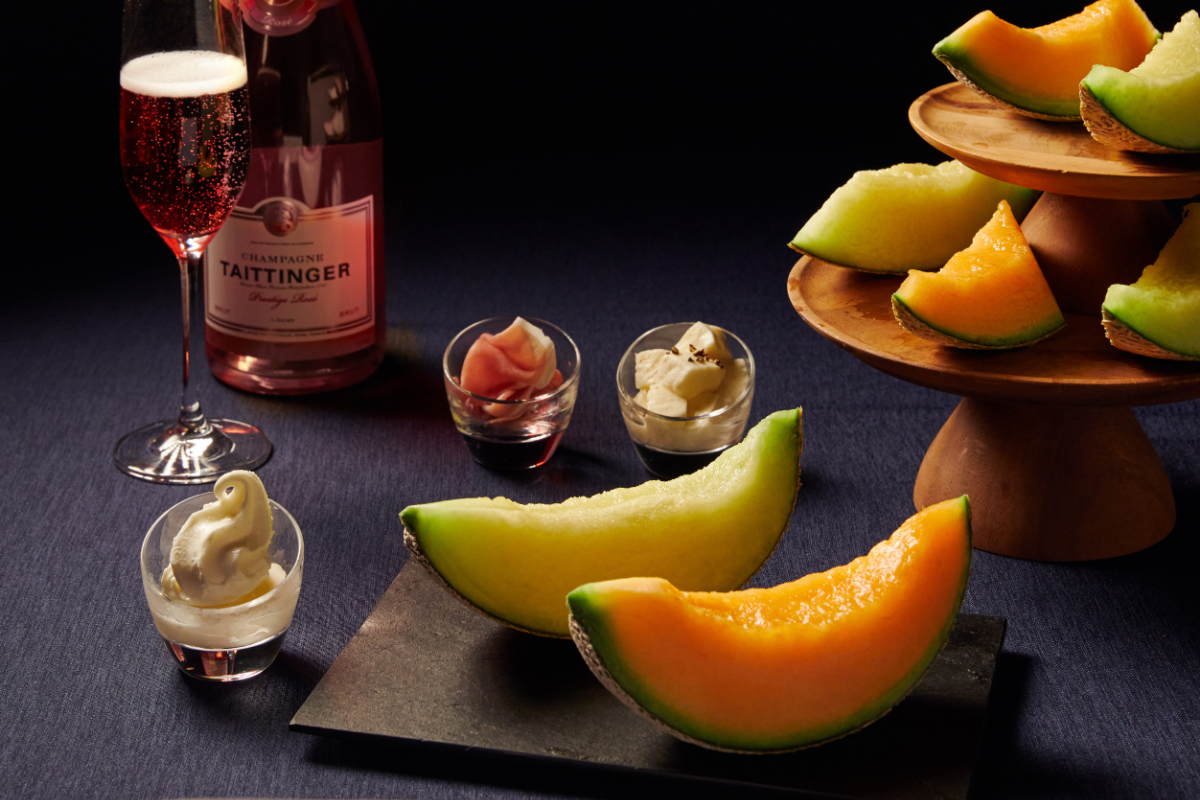今年は10種類のシャンパンを用意。さらにトッピングとしてモッツアレラ、ソフトクリーム、生ハムが登場。メロンは赤肉と青肉があり、トッピング次第でオードブルにもデザートにも変身!自分好みの贅沢マリアージュを堪能できます。