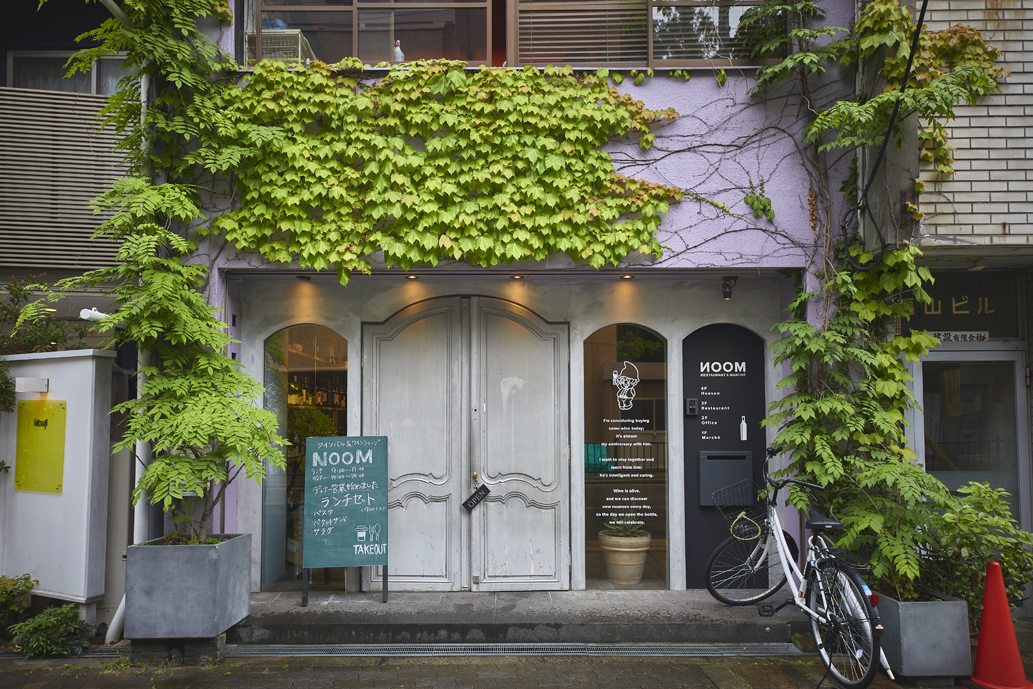 靭公園の南側、白壁が映える3階建てのビルが「イタリアン&ワインショップ NOOM(ノーム)」です。西洋スタイルの扉や、壁をはうツタが異国情緒たっぷりのムードを醸し出す、おしゃれな店構えがすてき。