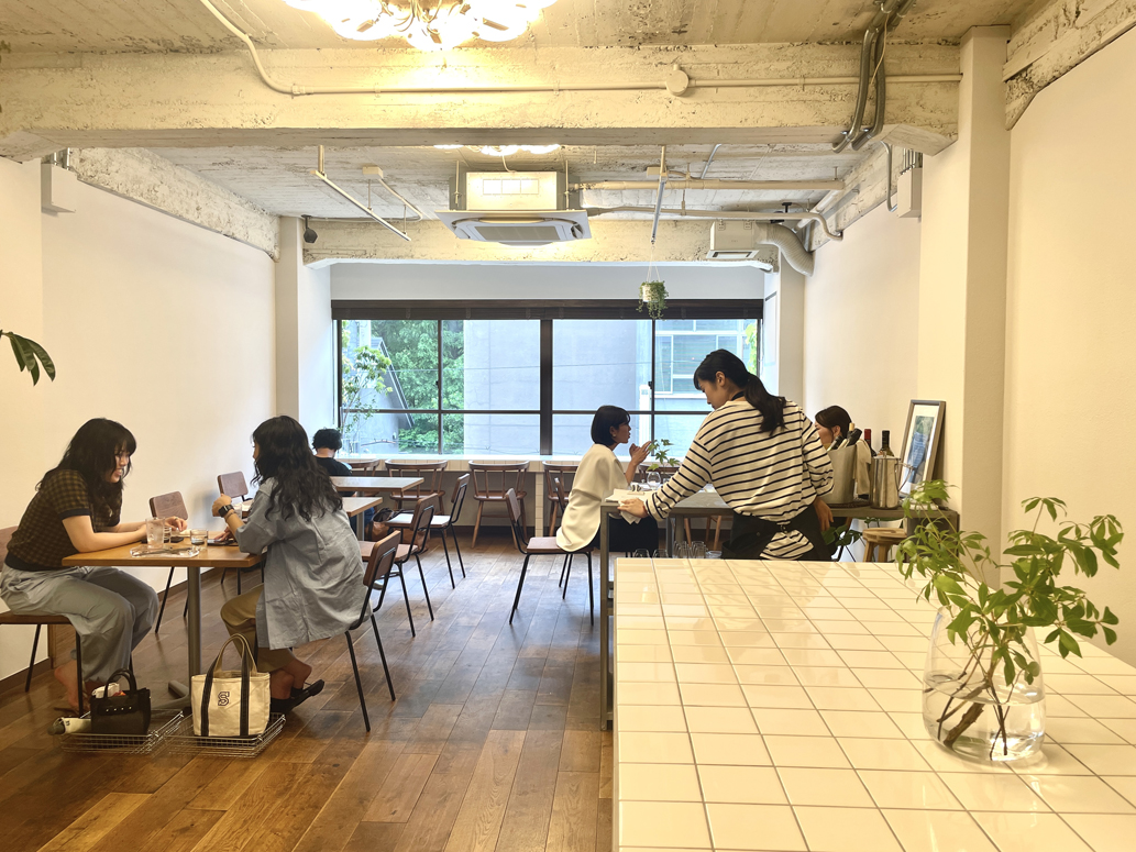 1階はワインをメインに、手づくり惣菜、海外の加工品などを販売するショップで、3階がダイニングスペース(写真)です。タイルのテーブルなどを配した広々とした店内で、朝9時からワインとイタリアンアラカルトを提供しています。「海外のブランチ文化を日本にも」をコンセプトに、2022年12月にオープン。靭公園の緑が間近に感じられるロケーションがなんとも優雅です。