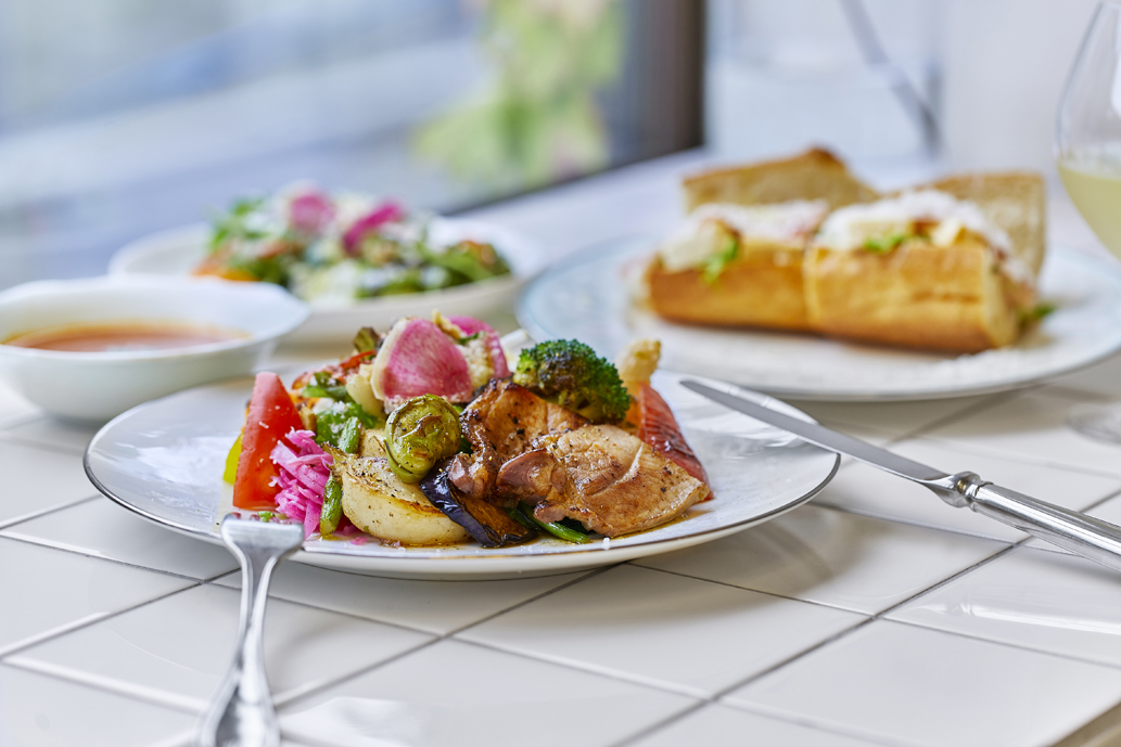 なかでもおすすめなのが、8種のオードブルを盛り合わせた「オールデイプレート」です。神戸の大人気精肉店「ふじお商店」の焼き豚をメインに、いちじく赤ワイン煮、ズワイガニのマカロニサラダ、グリル野菜に自家製ピクルスと盛りだくさん!ボリュームも十分なので2人でシェアして、ワインをあわせてゆっくり楽しむのもいいですね。