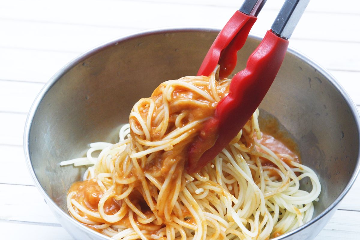 ソースはもったりとした感触なので、ボウルの中でパスタとよくからめてから、お皿に盛り付けます。
