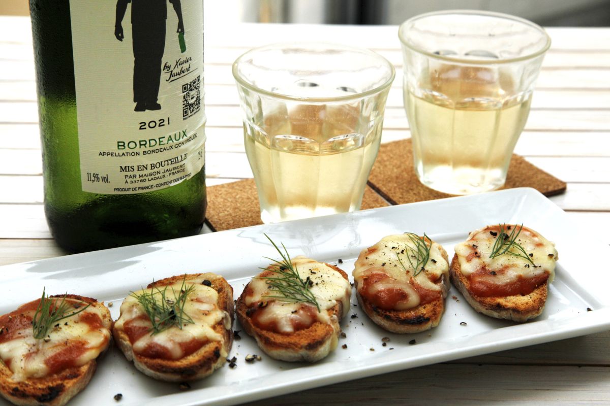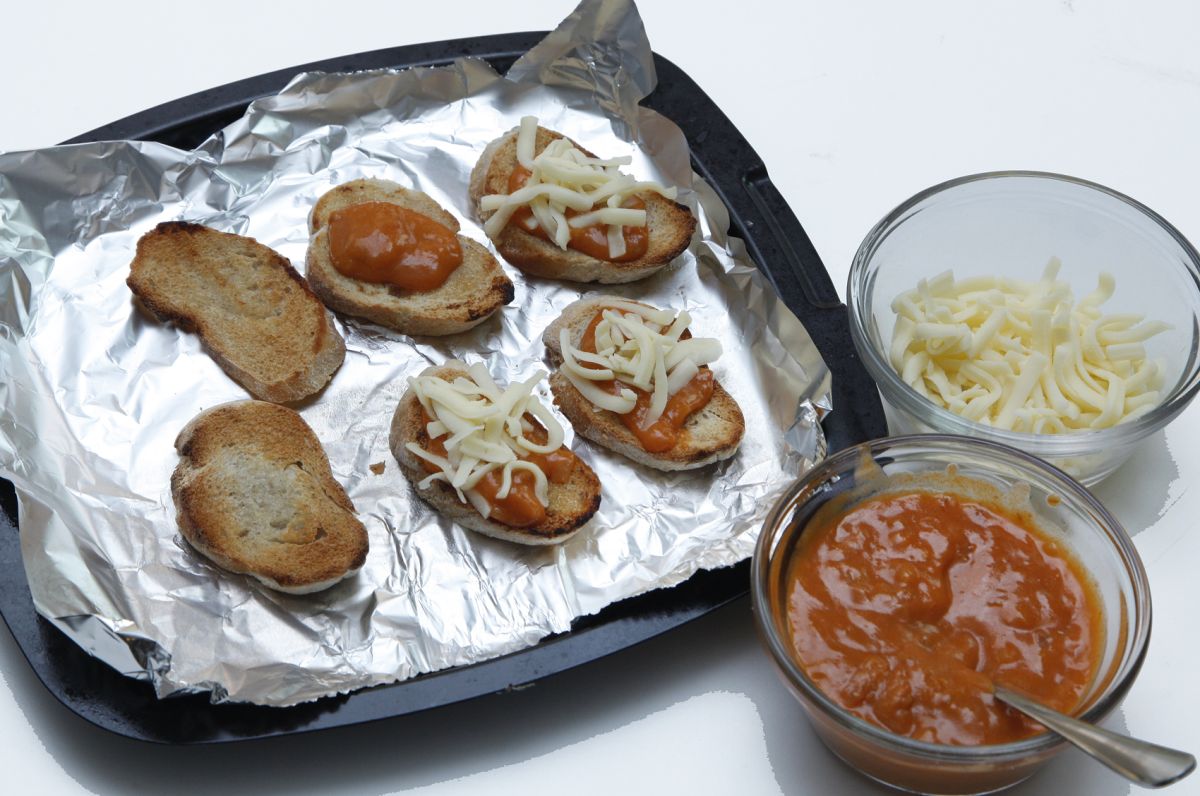 薄切りしたバゲットに、オリーブオイルを塗り、オーブントースターで軽く焼きます。取り出してから「カニの冷たいパスタソース」を薄く塗って、チーズをトッピング。再度オーブントースターでチーズがとろりと溶けるまで焼けばできあがり。