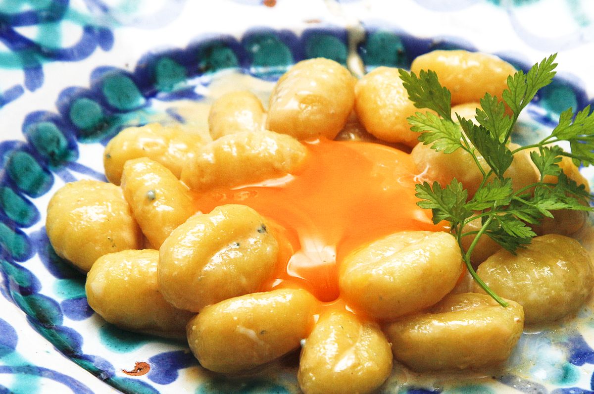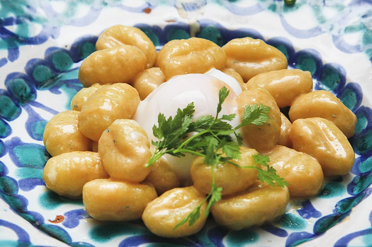 ゆでたニョッキに「クリームうにパスタソース」をからめて皿に盛り、中央に卵黄または温泉卵をトッピング。卵黄をつぶして、とろ〜りと流れる卵黄とソースと混ぜ合わせていただきます。ブルーチーズが加わることでパンチのある味わいになるのですが、それを卵黄がやさしくまとめて、もっちり食感のニョッキとよくからみます。