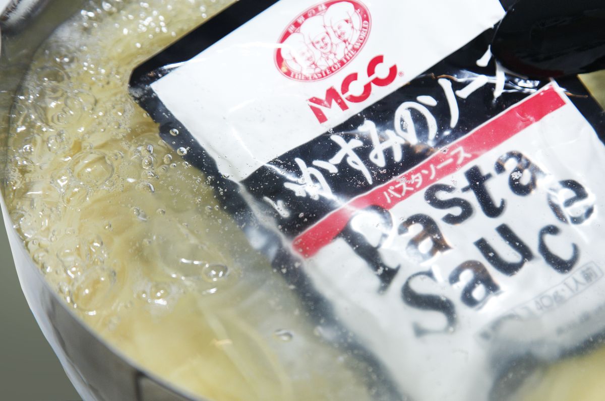 調理方法については「袋のまま沸騰したお湯で約5分間湯煎し、ゆでたパスタにかけてお召し上がりください」と記載されていたので、筆者は袋をきれいに洗ってから、パスタを茹でる鍋のなかに入れて温めました。