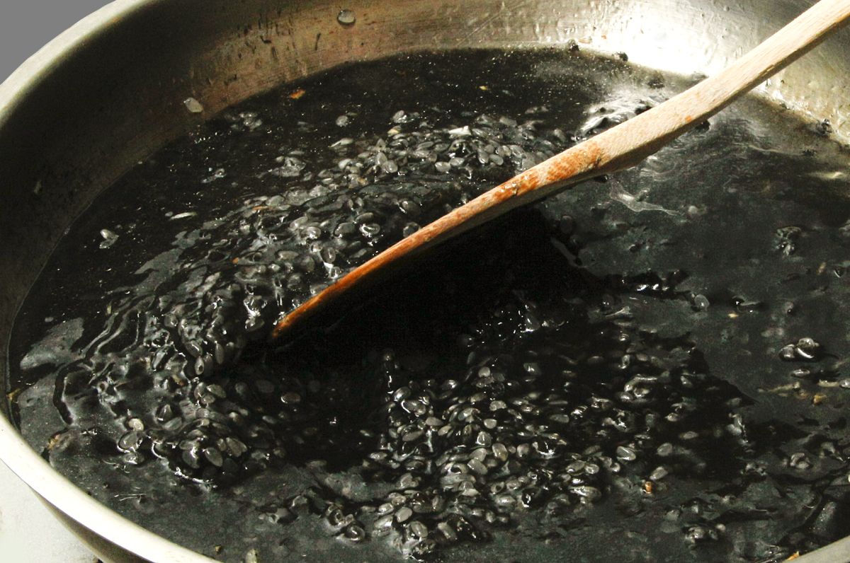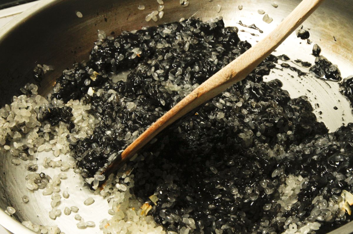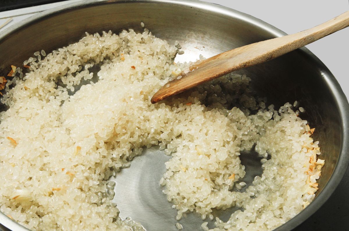 作り方は、まずフライパンにオリーブオイルたっぷり(大さじ2くらい)と、ニンニクのみじん切りを入れ、弱火で加熱して香りを立たせます。(「MCC いかすみのソース」にはすでにニンニクが入っているので、ニンニクは省いても大丈夫です)ここに米(1合半)を洗わずに加えて、米が透き通るまで弱火で炒め、米全体をオリーブオイルでコーティングします。