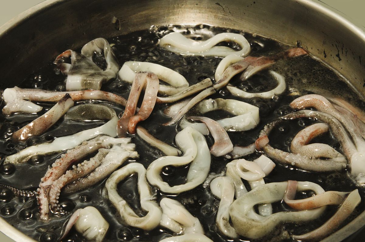 沸騰したら、切ったイカ(胴は輪切り、ゲソは一口大)を加え、ふたをして(ふたがない場合は、アルミ箔で覆ってもOK)、最弱火にして10分ほど加熱。次にイカとは時間差で、適当な大きさに切ったアスパラやパプリカを加えて、再びふたをして4〜5分ほど加熱します。