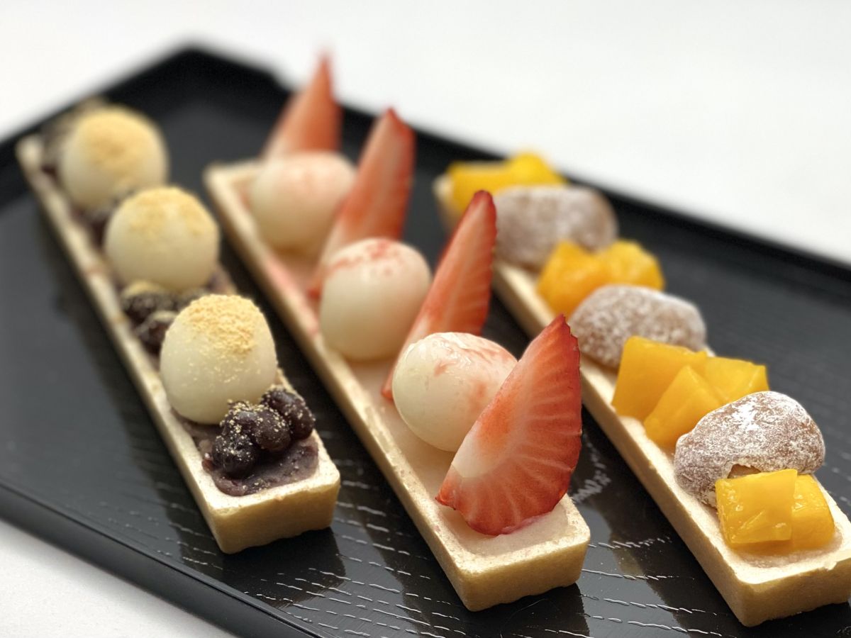 そして最後にご紹介するのは、「デセールもなか」です。こちらはオリジナルの甘味で、スティック状のモナカに北海道産小豆の手作り粒あんや白あんを敷き詰め、生キャラメルやマンゴーなどフルーツと団子が添えられています。どの味もおいしそうで、甘味までもれなく楽しめること間違いなしです。