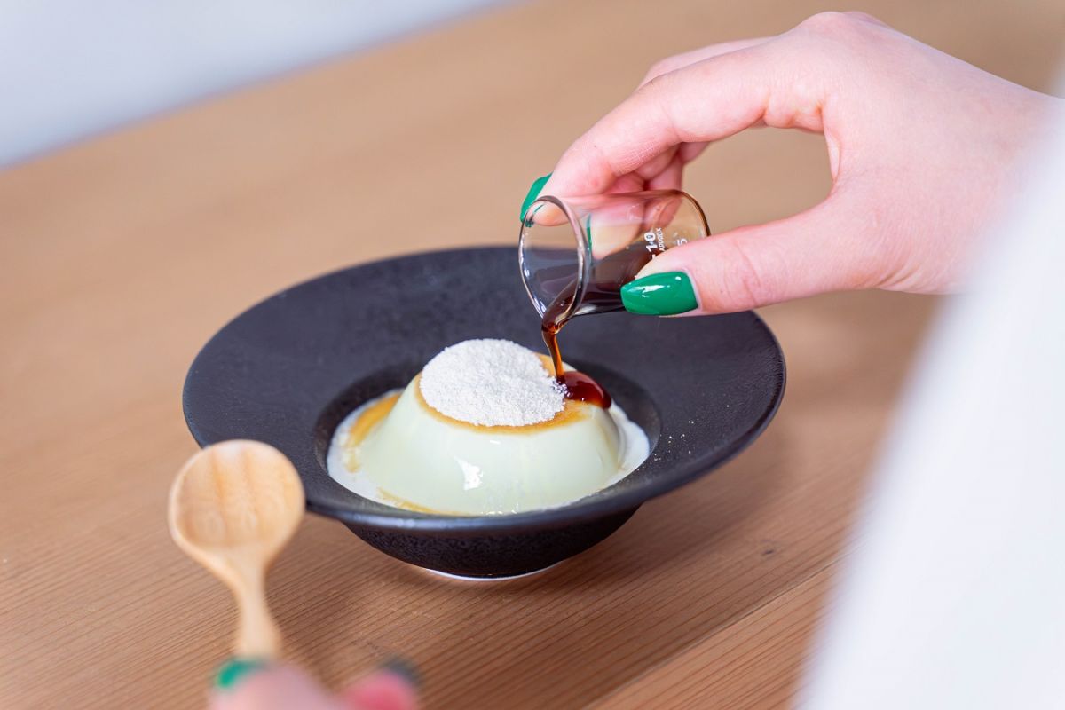 食べる直前に黒蜜もかけて、甘味をプラス。なめらかなミルクプリンと舌触りの良い和三盆が溶け合いつつ、黒蜜のコクのある甘味が豊かな余韻を残します。シンプルだからこそ、素材ひとつひとつのおいしさが際立ちます。
