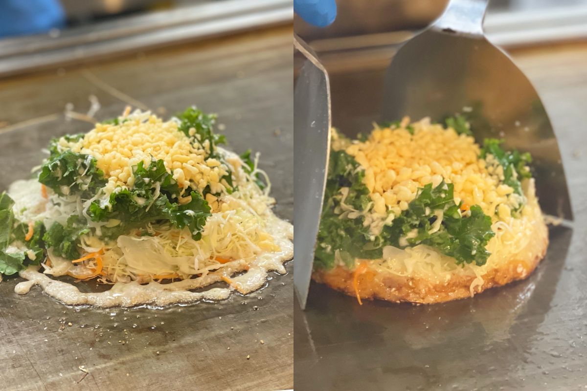 薄く敷いた生地の上に、千切りのキャベツとにんじん、ケールを乗せ、中央に卵を落とし、さらに天かすを乗せて形を整えていきます。生地がほとんど見えないほどの野菜の量に驚き。