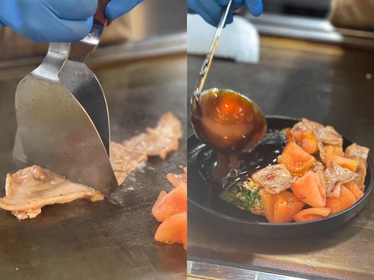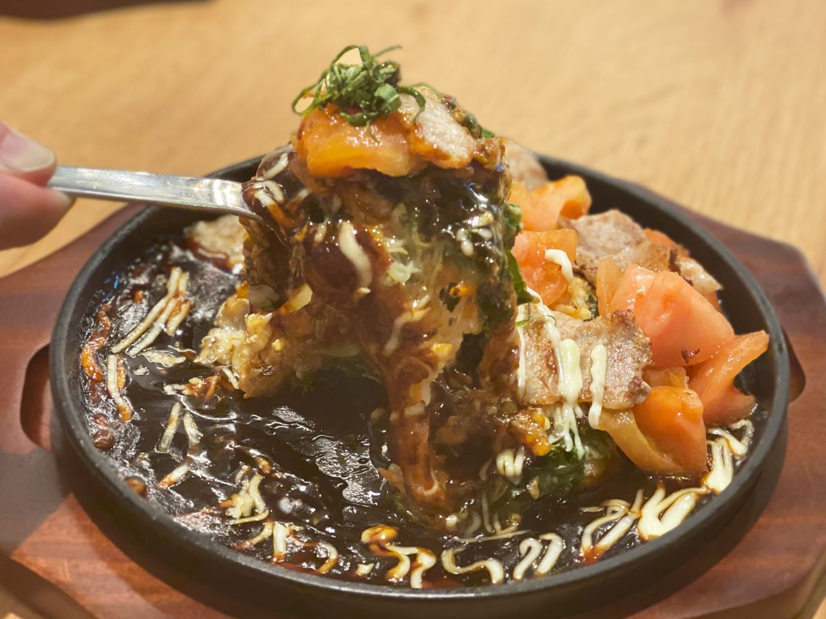 最後に具材を鉄板プレートに乗せ、ソースをかけた状態で再度熱し、完成。ぐつぐつとした音と見た目に食欲を刺激されますよ!