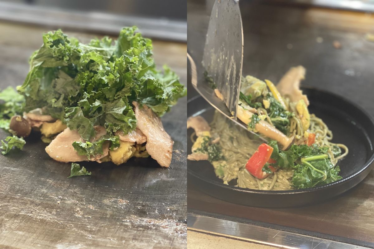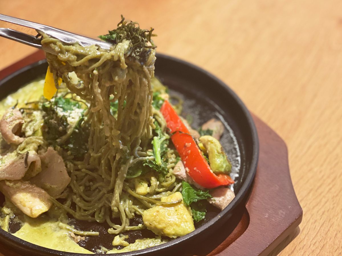 そこに茶そばを加え、ほうれん草と山芋を使用した和風だしのソースを絡めてでき上がりです。