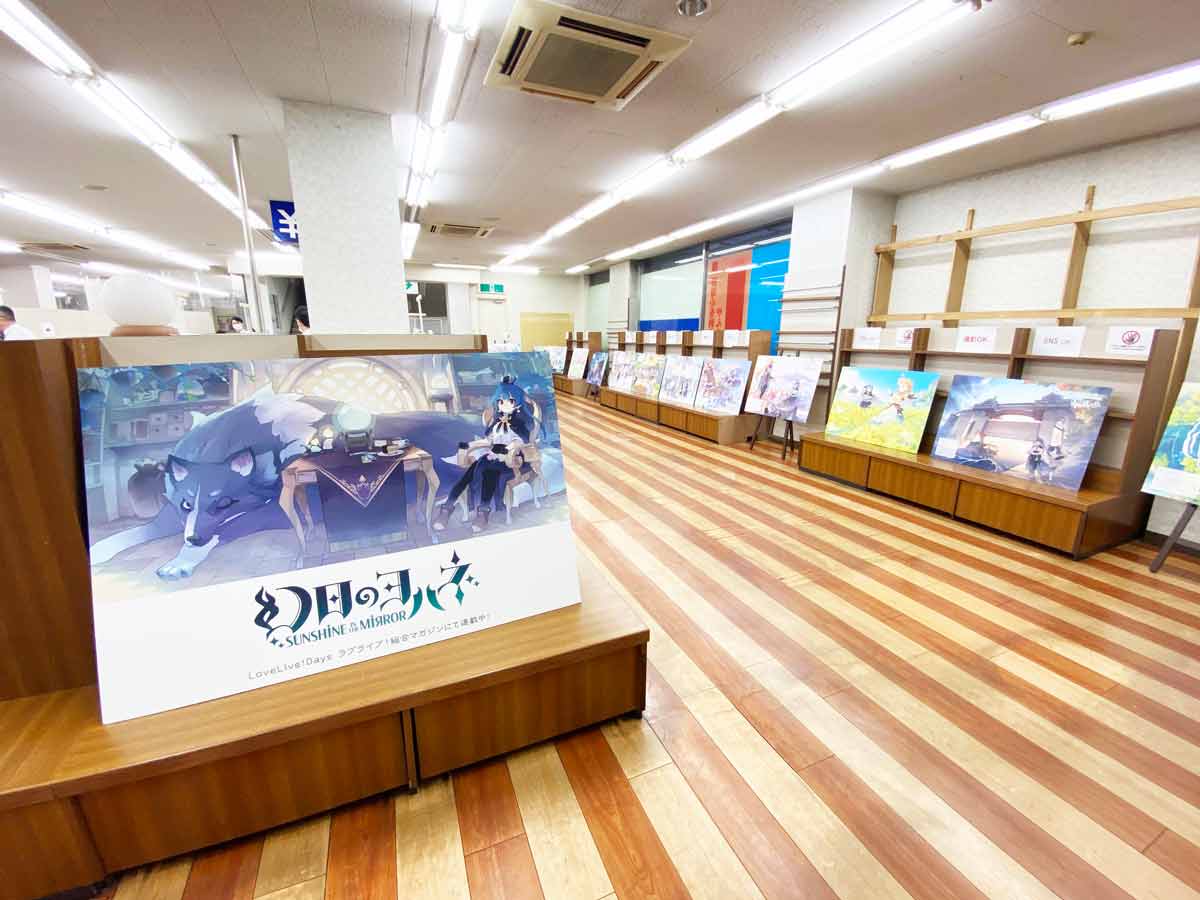 レジを挟んだ裏側には「幻日のヨハネ」のイラスト連載のパネル展示も準備。30枚のパネルが並ぶ姿は壮観でした。