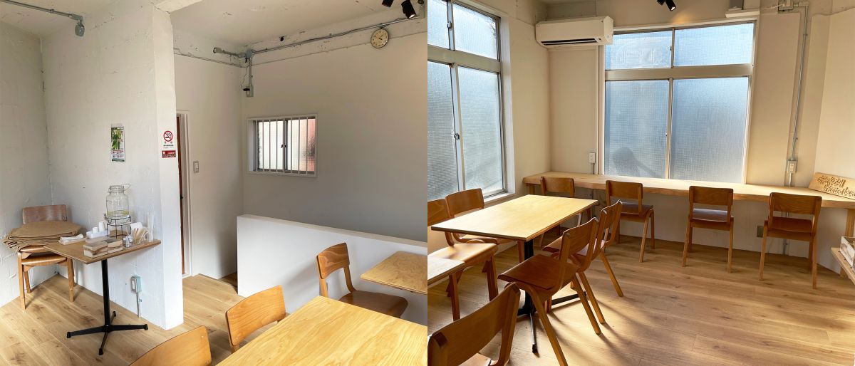 店内は交番の名残を留めつつ、1階は注文カウンター、2階はイートインスペースに改装されています。白を基調とした、シンプルながらも温かみのある空間です。
