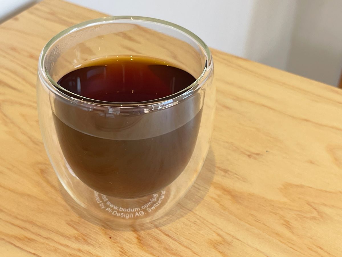 ダブルウォールカップで提供してくれるので持ったときに熱くなく、コーヒーが浮いているように見えるビジュアルもスタイリッシュ。