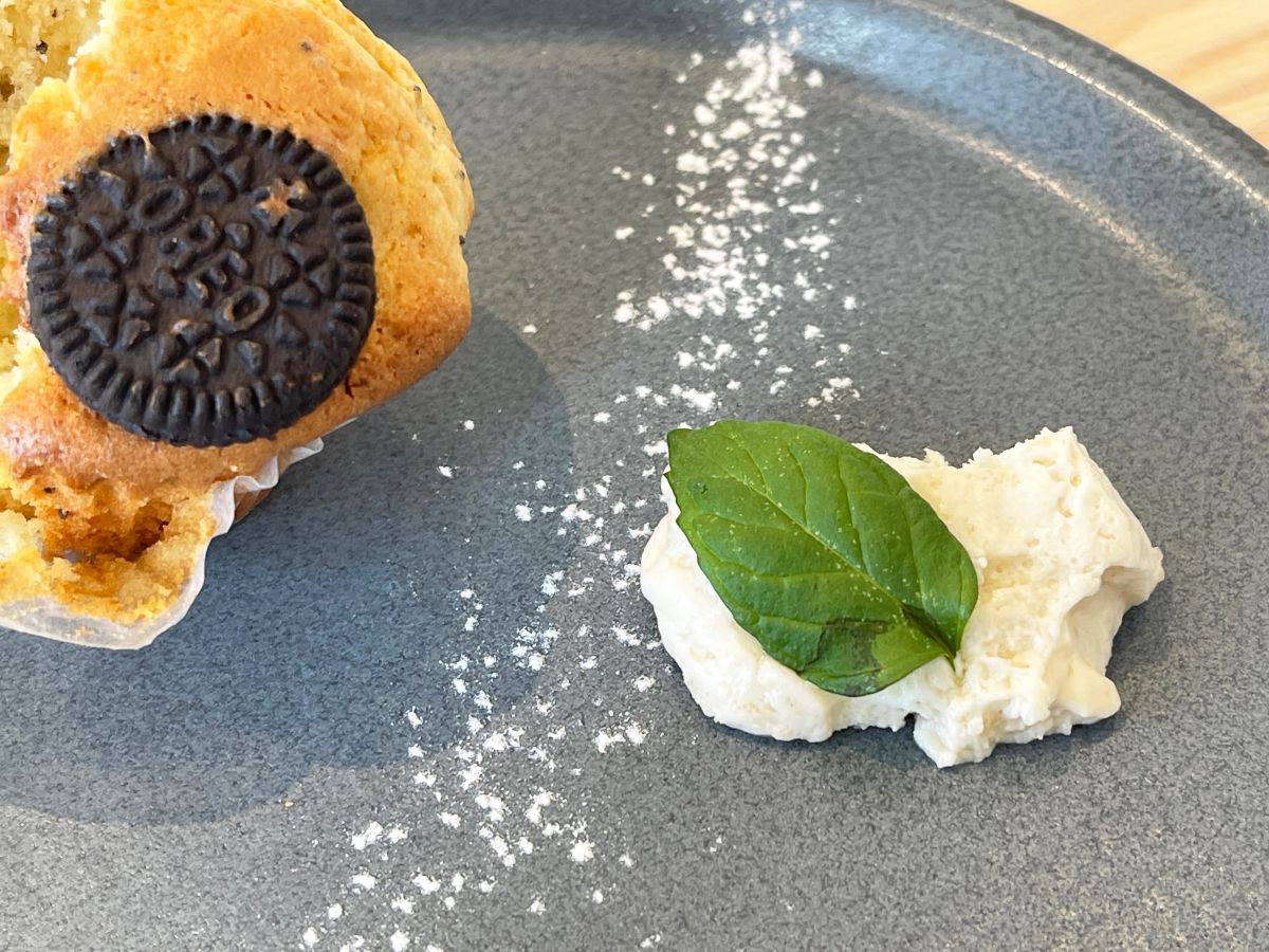 日替わりの自家製マフィンも人気メニューのひとつ。取材した日はブラックココアクッキーがふんだんに使用されていました。サイズは2種類用意されていて、こちらはミニサイズ。大きいサイズは400円です。