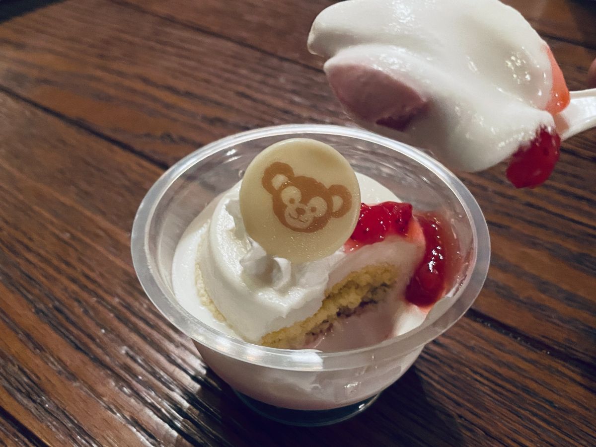 デザートのストロベリー&ミルクムースは上から生クリーム、スポンジ、ストロベリームースが3層に重なっています。トッピングやカップ底のさわやかなベリーソースで甘さ控えめに。ダッフィーの顔が描かれたホワイトチョコレートがキュートです。