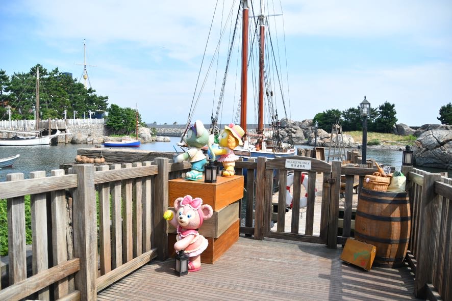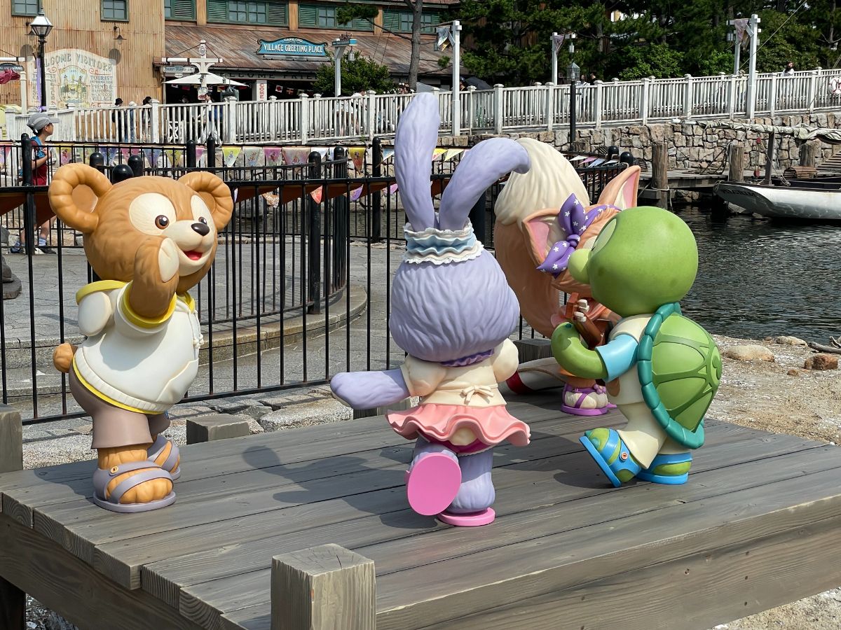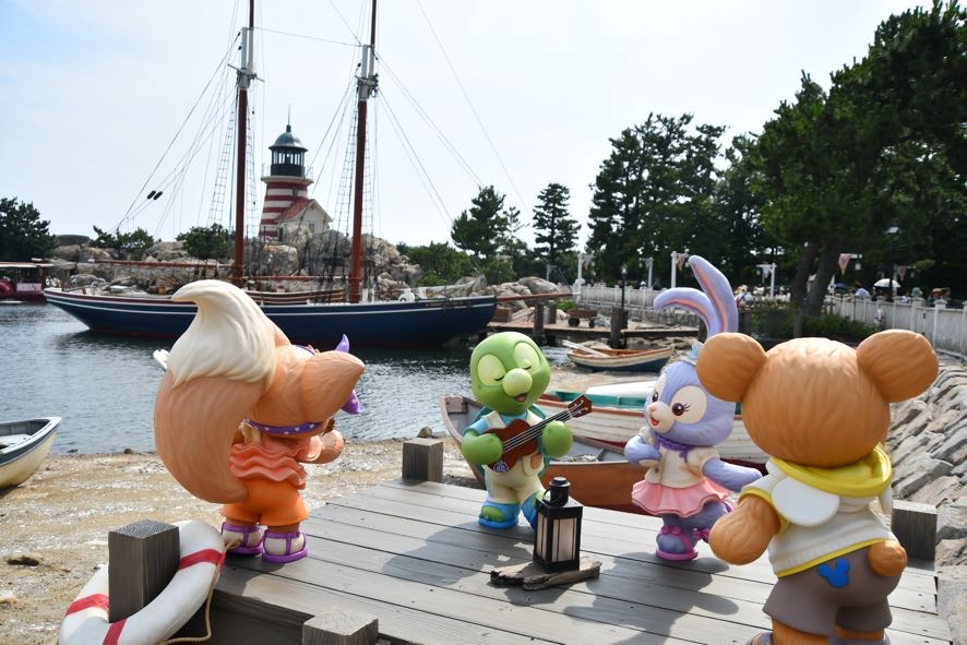 ちいさな船着き場にはダッフィー、ステラ・ルー、オル・メル、リーナ・ベルが、常設のフォトポイントがある桟橋にはシェリーメイ、ジェラトーニ、クッキー・アンが。楽器を手にしたり、踊ったりしている姿がかわいいです。