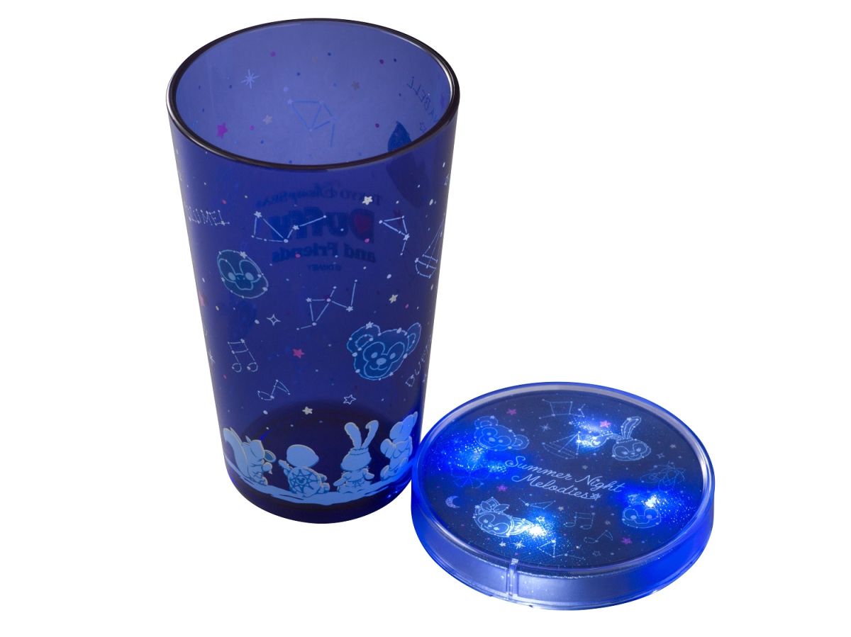 同じく、対象メニュー+1400円の「スーベニアタンブラーセット」は、透明感のある青のタンブラーに夜空を眺めるダッフィーたちと、ダッフィー&フレンズの星座をデザイン。スイッチを入れると青と白に交互に優しく光るコースター付きです。
