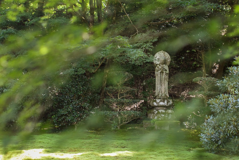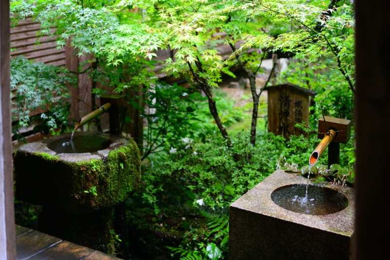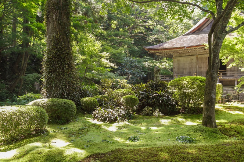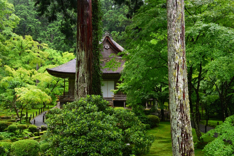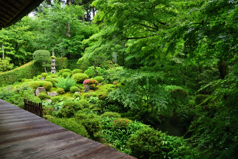 この往生極楽院と宸殿の周囲に広がるのが、三千院を代表するもう一つの庭園・有清園(ゆうせいえん)です。杉や檜(ひのき)の木立と青々とした苔が美しい調和を見せ、池泉には滝から水が流れ自然の流れを表現。春はヤマザクラやシャクナゲ、夏の新緑、秋の紅葉に、雪景色と、四季折々の美しさで楽しませてくれます。