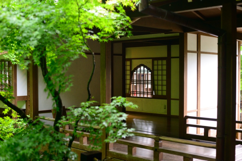 宸殿から靴を履いて順路を進みます。苔むした緑に囲まれた絵になる空間の先には、三千院の歴史の源ともいえる往生極楽院(おうじょうごくらくいん)がたたずんでいます。
