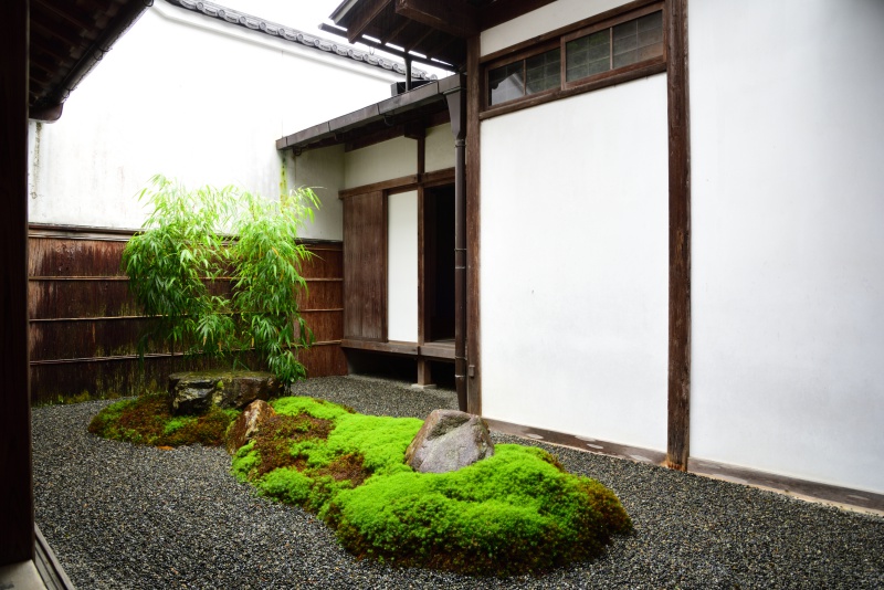 受付を済ませてまず入るのが客殿。その名の通り、来客と面会するための建物です。靴を脱いで順路を進むと苔むした緑が美しいミニ庭園が姿を表し、参拝客を出迎えてくれます。