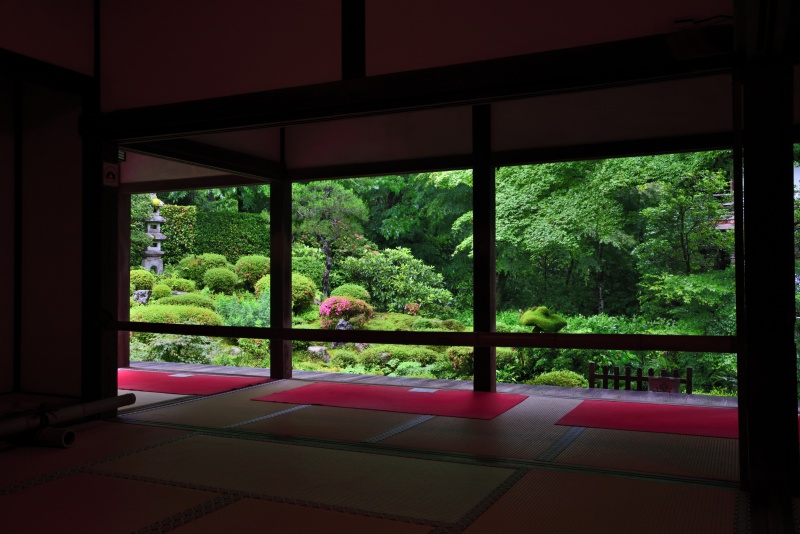 さらに客殿の中を進むと、三千院を代表する庭園が見えてきます。江戸時代の茶人・金森宗和(かなもりそうわ)が修築したと伝わる聚碧園(しゅうへきえん)です。